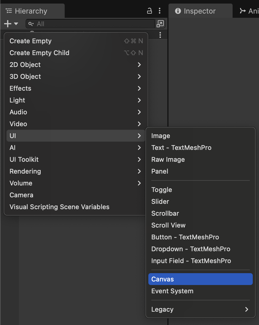 From the Hiearchy tab, click + > UI > Canvas.