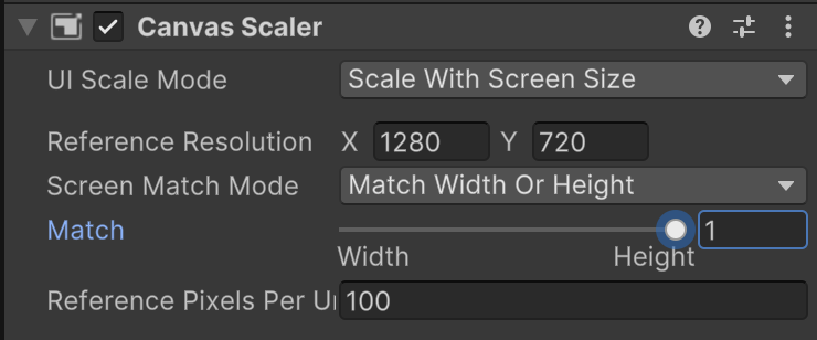 On the Canvas Inspector, set Canvas Scaler to a Reference Resolution of 1280 by 720 with Match set to full Height.