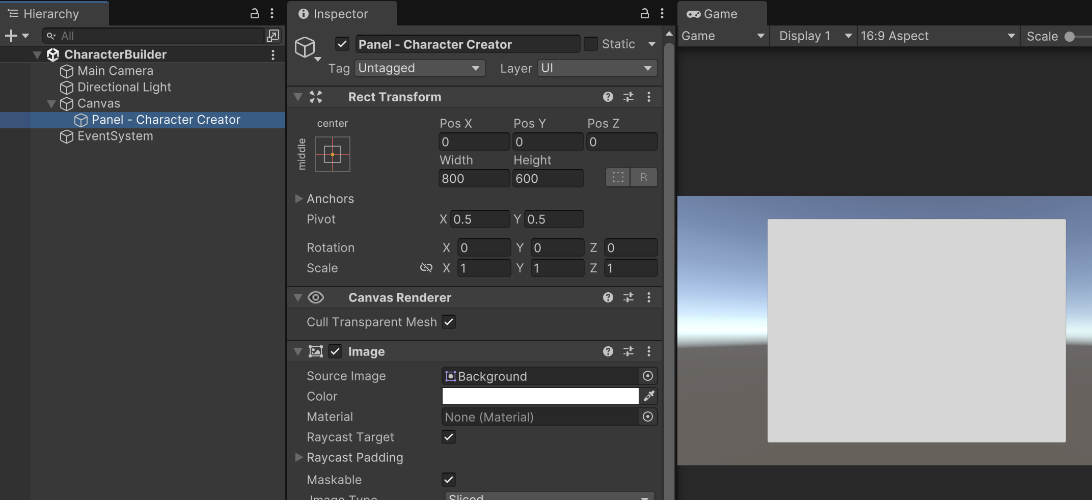 Add a UI Panel as a child of the Canvas and name it "Panel - Character Creator". Center the Panel with a size of 800 by 600. Remove the transparency from its image. In the game preview you should see a centered UI Panel that takes up most the screen with a solid background.