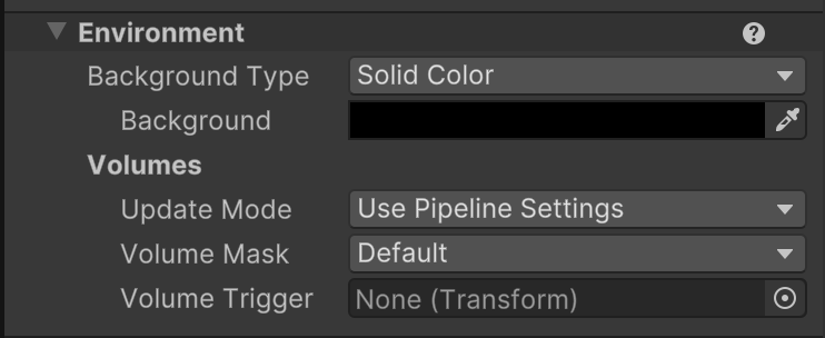 Since this assignment's scene focuses on UI, there is no need to render an environmental skybox as the background. Select the Main Camera in the hierachy. (You may notice compared to older assignments that the URP Camera has a lot of new features.) In the Inspector, scroll down to the Environment section and set the Background Type to a Solid Color of black.
