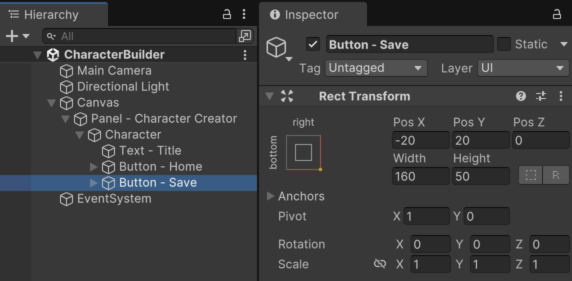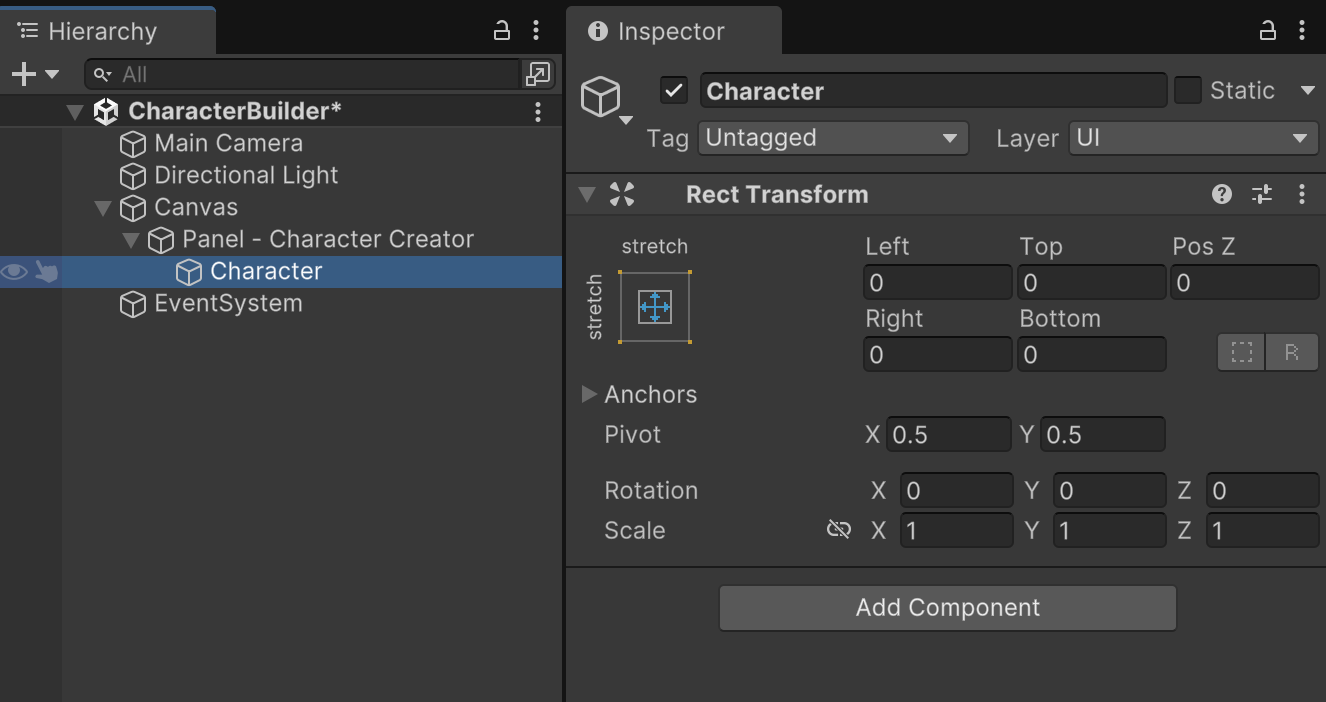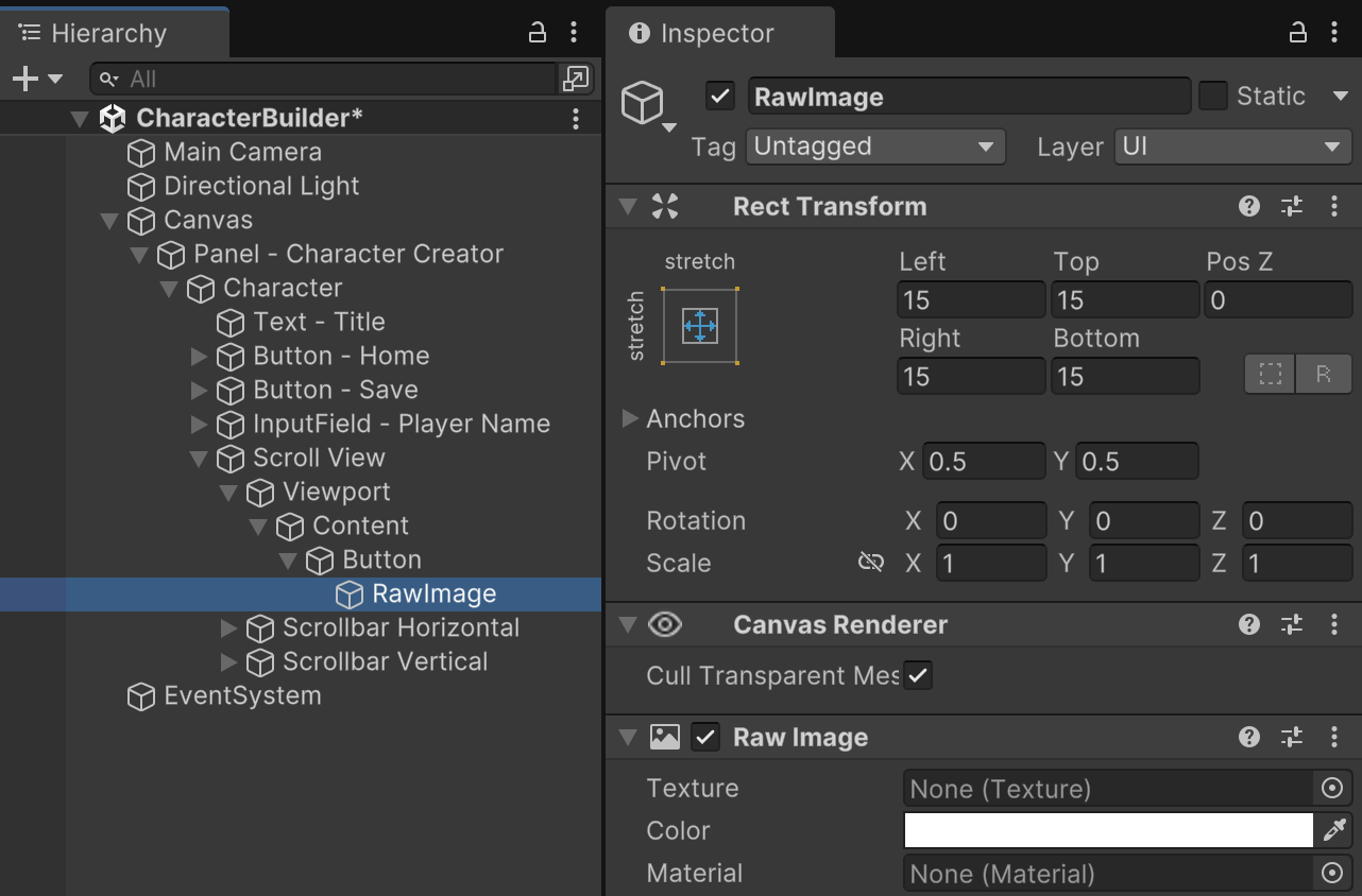 We are using RawImage instead of Image because the content that portrays our character model choices will be rendered dynamically. We do not have a static pre-rendered image file available that would fit the more familiar Image component.