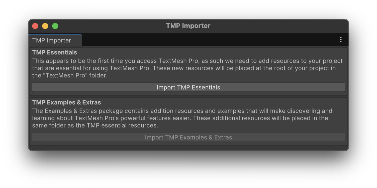 Within this Character menu, add a "Text - TextMeshPro" object and name it "Text - Title". (You may have to confirm "Import TMP Essentials")