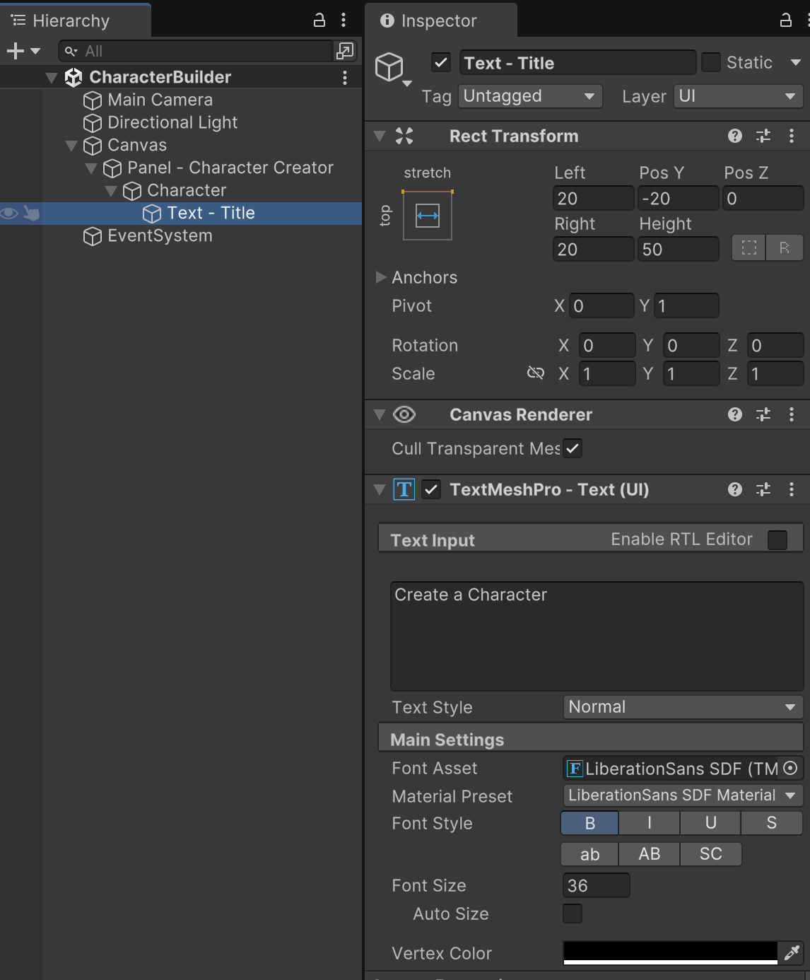 "Text - Title" will be anchored to the top of its parent stretching the full width with a spacing of 20 relative to all sides. Because this is title content, it should be styled with boldness and sizing appropriate for a header. Set a title text of "Create a Character" for this content. Instead of the default white on light background which is unreadable, use a black font color.