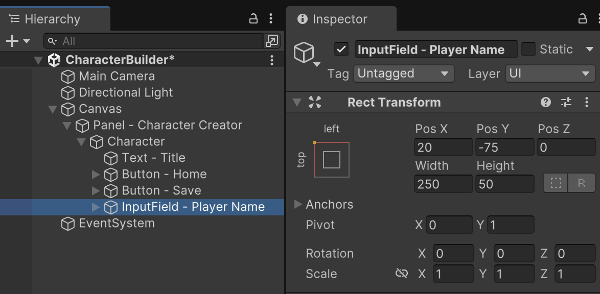 Anchored to the upper-left, add an "Input Field - TextMeshPro" object as a child of the Character menu. Name it "InputField - Player Name".