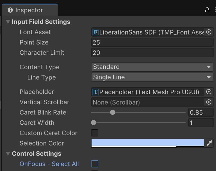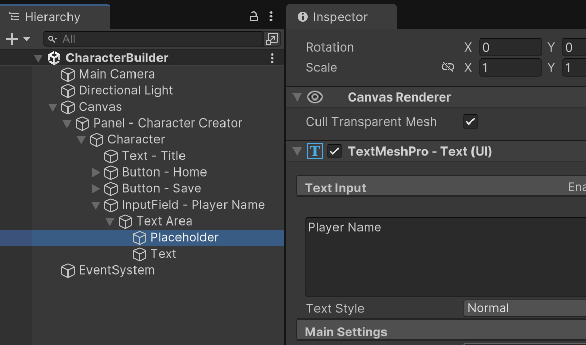 Input Fields work in concert with multiple child objects. By inspecting the Placeholder child, we can customize what text shows up when no user text has been input yet.