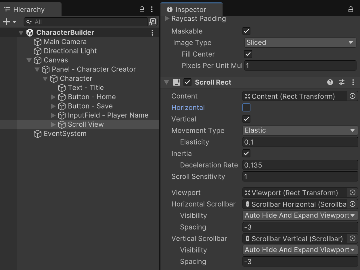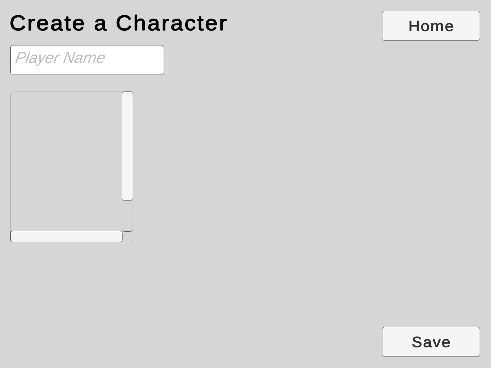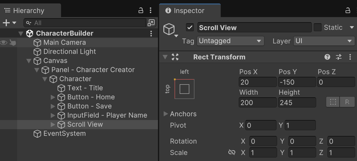 Add a UI Scroll View as the next child in the Character menu hierarchy. Anchor it top-left positioned below the player name input field.