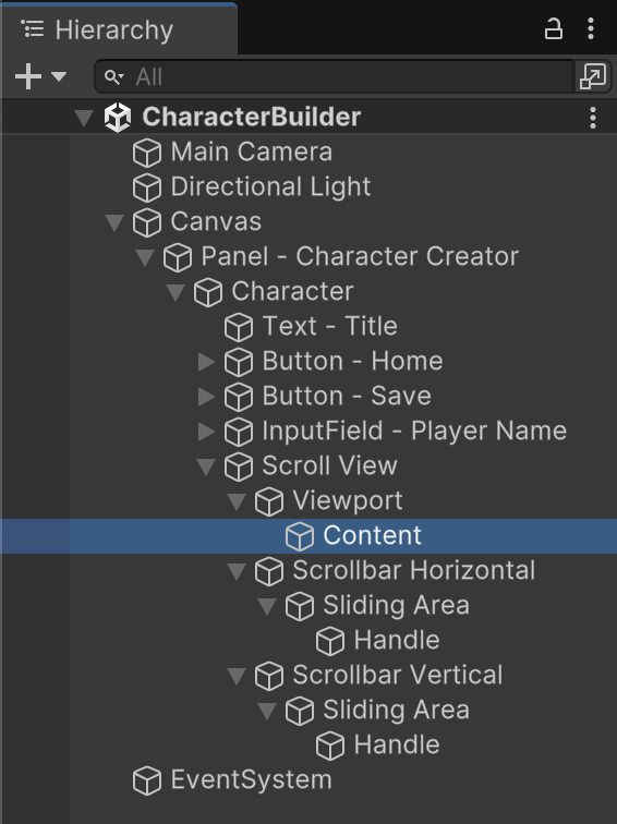 While you can freely arrange gameObjects within the scroll view "Content", we will instead use some components to automate our content layout and sizing.