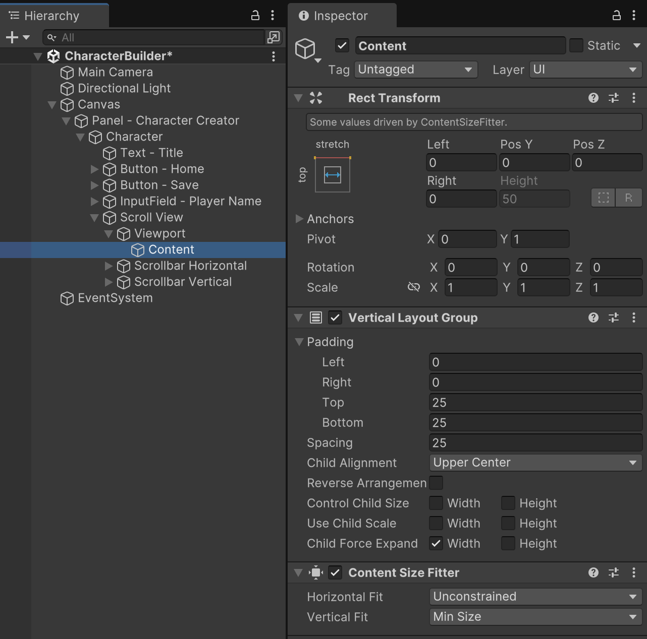 Also add a component for Content Size Fitter. This component automates resizing the "Content" gameObject based on how much content is inside. With this component, our "Content" view will grow very tall for a long list of items, or shrink smaller when fewer items are present. This ensures we can pan the full length of our content without any missing or excess scroll distance.