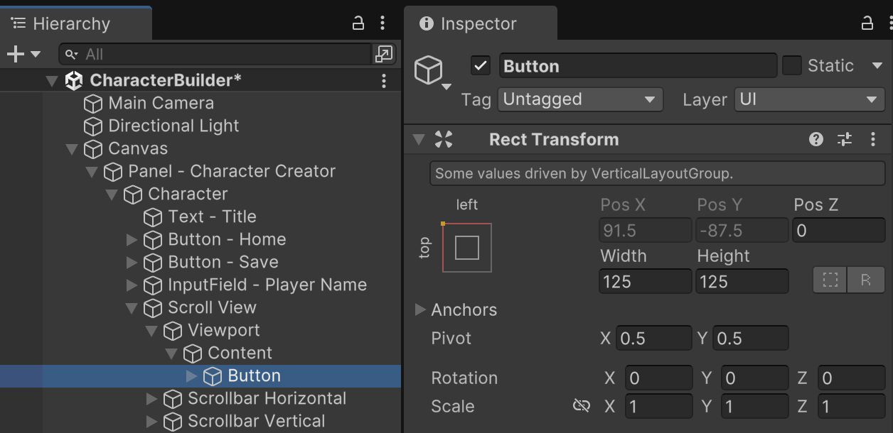 We will have 3 character model options in this prototype. Duplicate the Button until there are three sibling gameObjects. You can see how each button automatically takes the next position vertically in the content layout, while the scroll viewport cuts off rendering of any content that is past the scroll view boundary. We will hook up the missing images and button functionality in a future step.