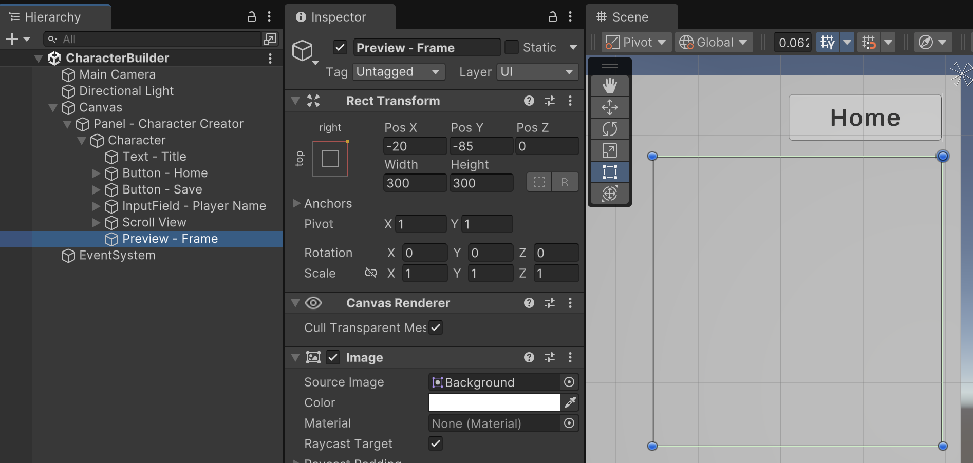 Create a UI Panel named "Preview - Frame" as a child of the Character menu. Anchor it to the upper-right below the Home button with the settings as potrayed in these instructions. Remove the transparency of the background Image so it renders with an opaque frame.