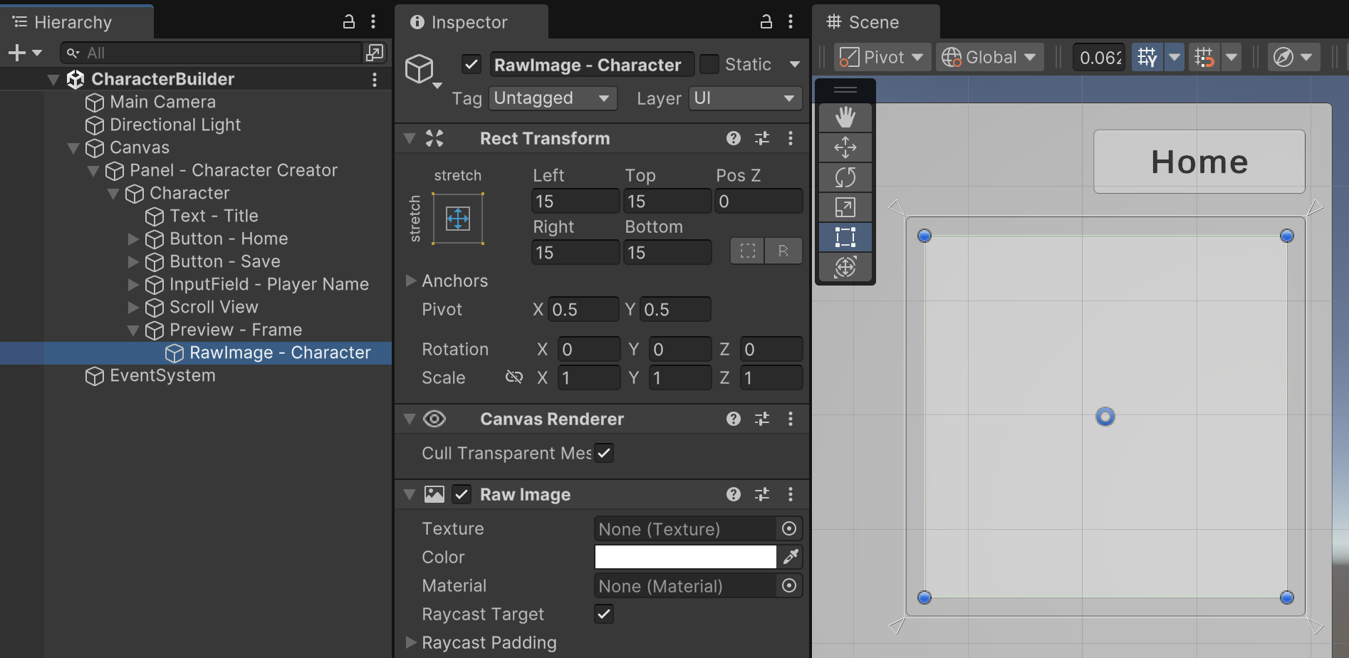 As a child of the Frame, add a UI RawImage named "RawImage - Character" stretched to fill the frame with 15 spacing on all sides. We will code this to dynamically portray player character selections in a future step.