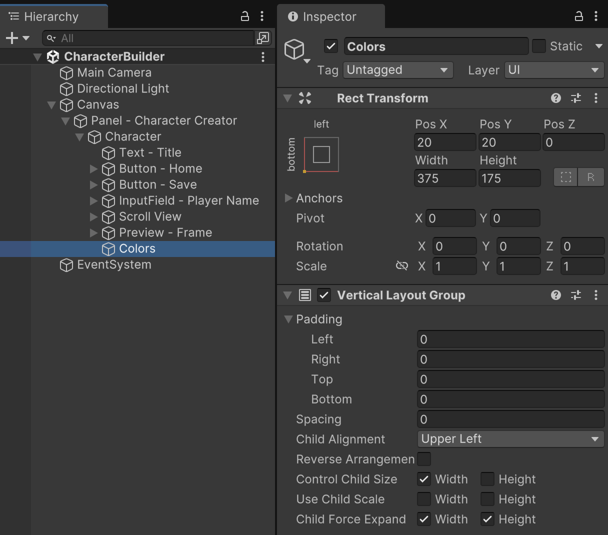 Create an empty object named "Colors" as a child of the Character menu anchored to the bottom-left. Position and size it as portrayed in the instructions. This UI view will contain 3 rows for manipulating the separate Red, Green, and Blue color channels of our character model. To keep these rows organized, add Vertical Layout Group component to the "Colors" gameObject.