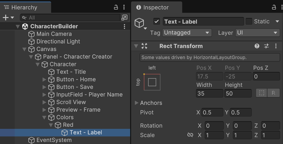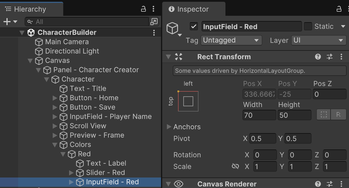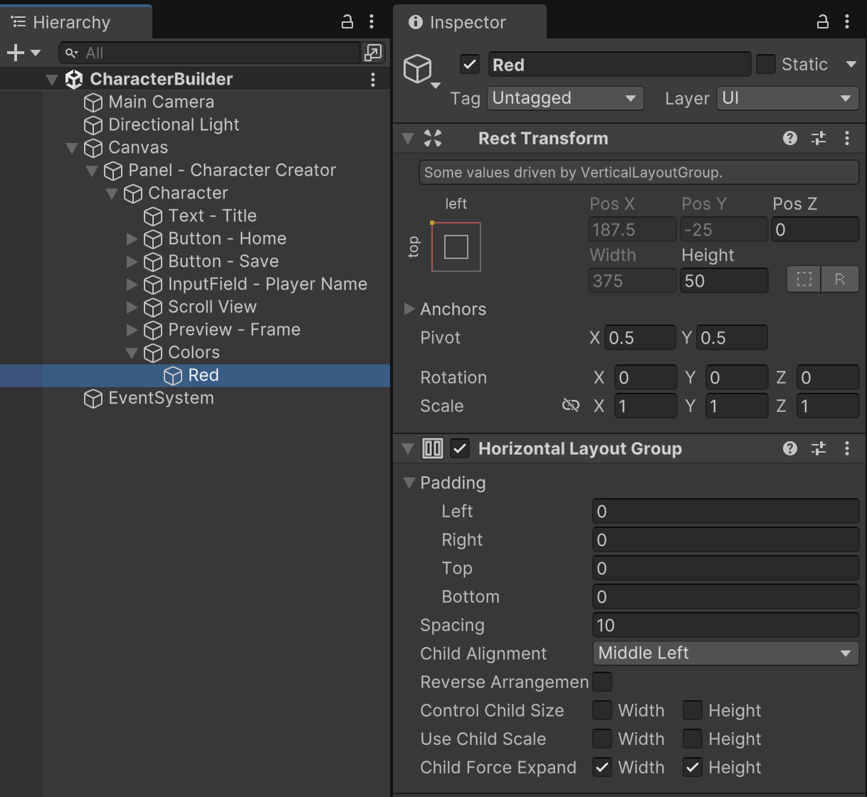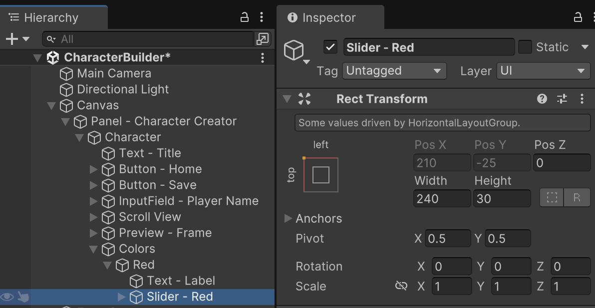 Add an empty object named "Red" as a child of the "Colors" object. Since most of the settings are controlled by the parent layout, the main setting in the RectTransform is the height. Each row in the Colors UI is divided into three columns. A Horizontal Layout Group component helps automate positioning in this kind of layout.