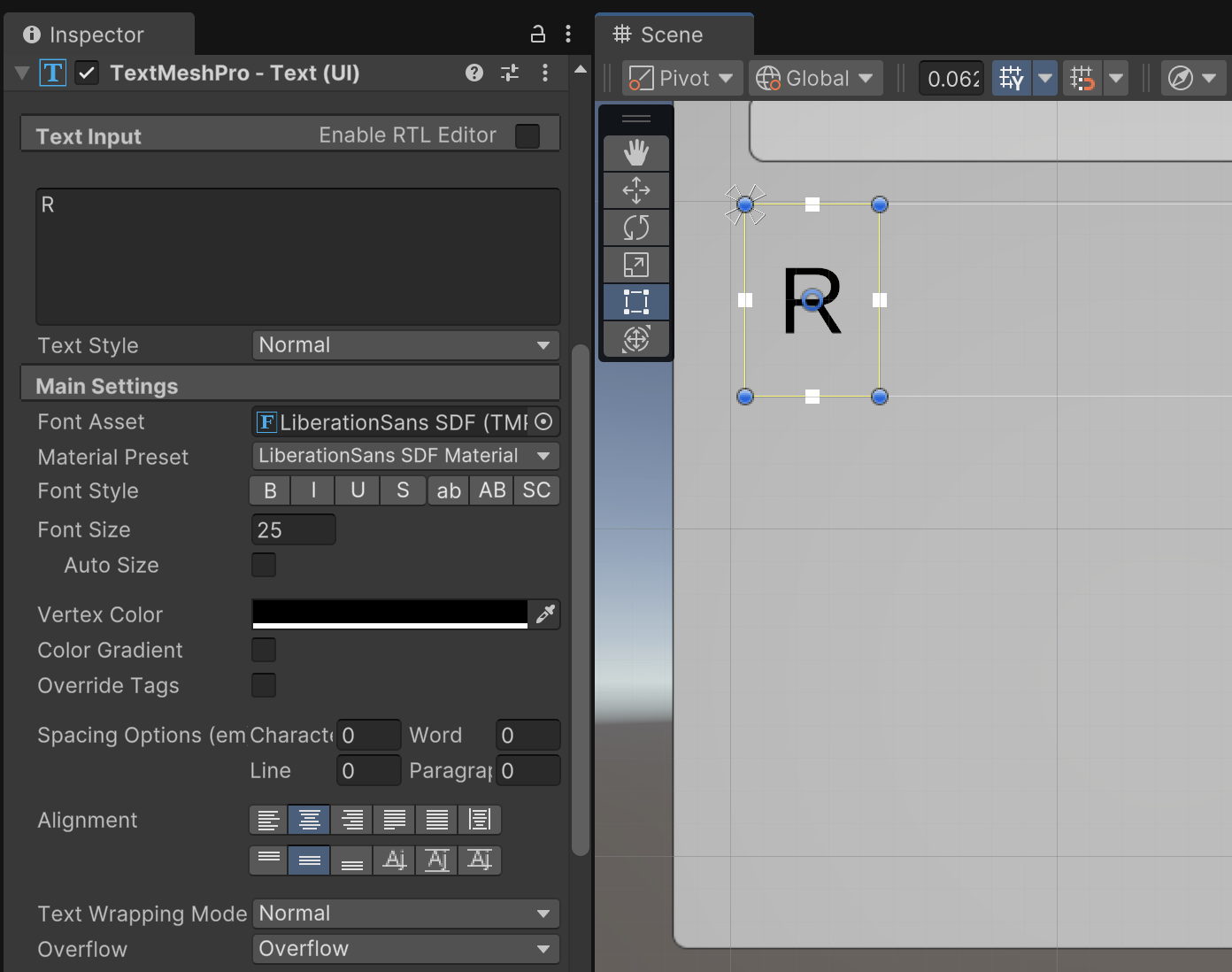Start by adding a "Text - TextMeshPro" object named "Text - Label" as a child of the Red object. Size appropriately as portrayed in the instructions. Use the text "R" for this label and style as portrayed in the images. Note that this text is both horizontally and vertically centered in the Text Alignment settings.
