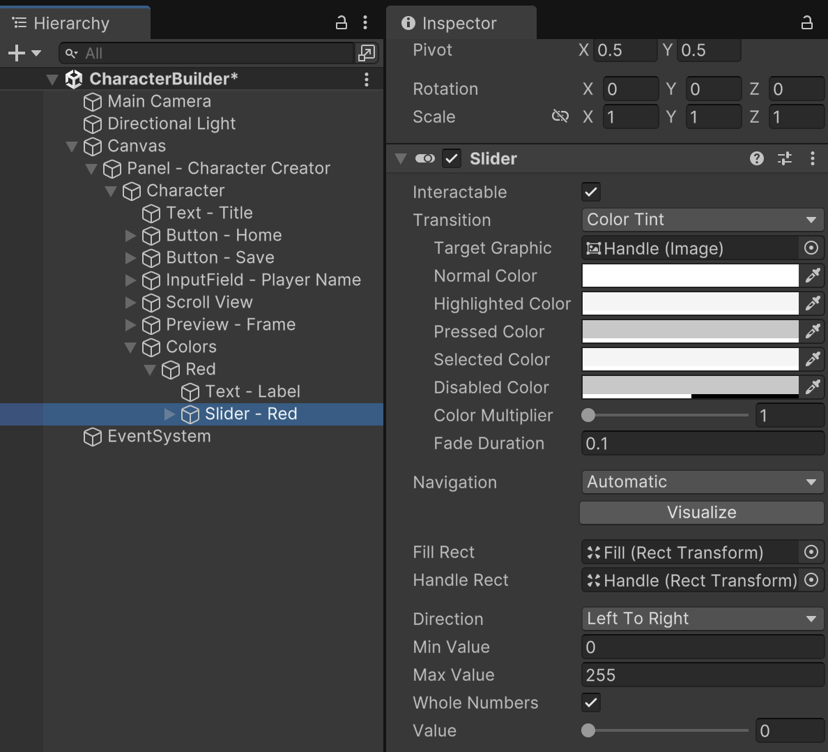 Add a UI Slider object named "Slider - Red" as a child of the Red object. Size appropriately as portrayed in the instructions.