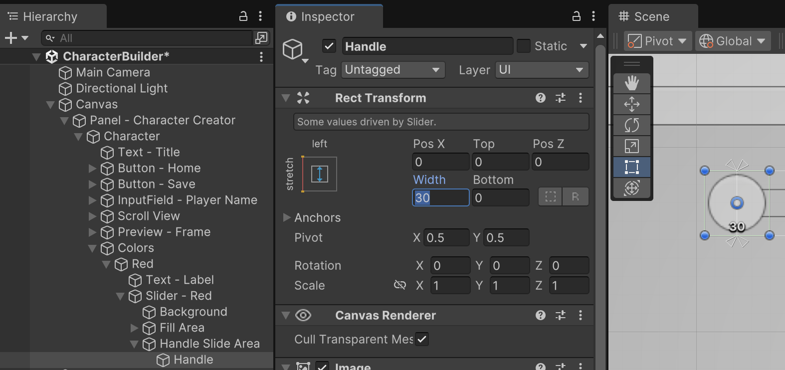 Expand the Slider gameObject to reveal all the children objects that allow it to work. To avoid distorting the UI, we will need to adjust the Handle width to match our customized Slider height.