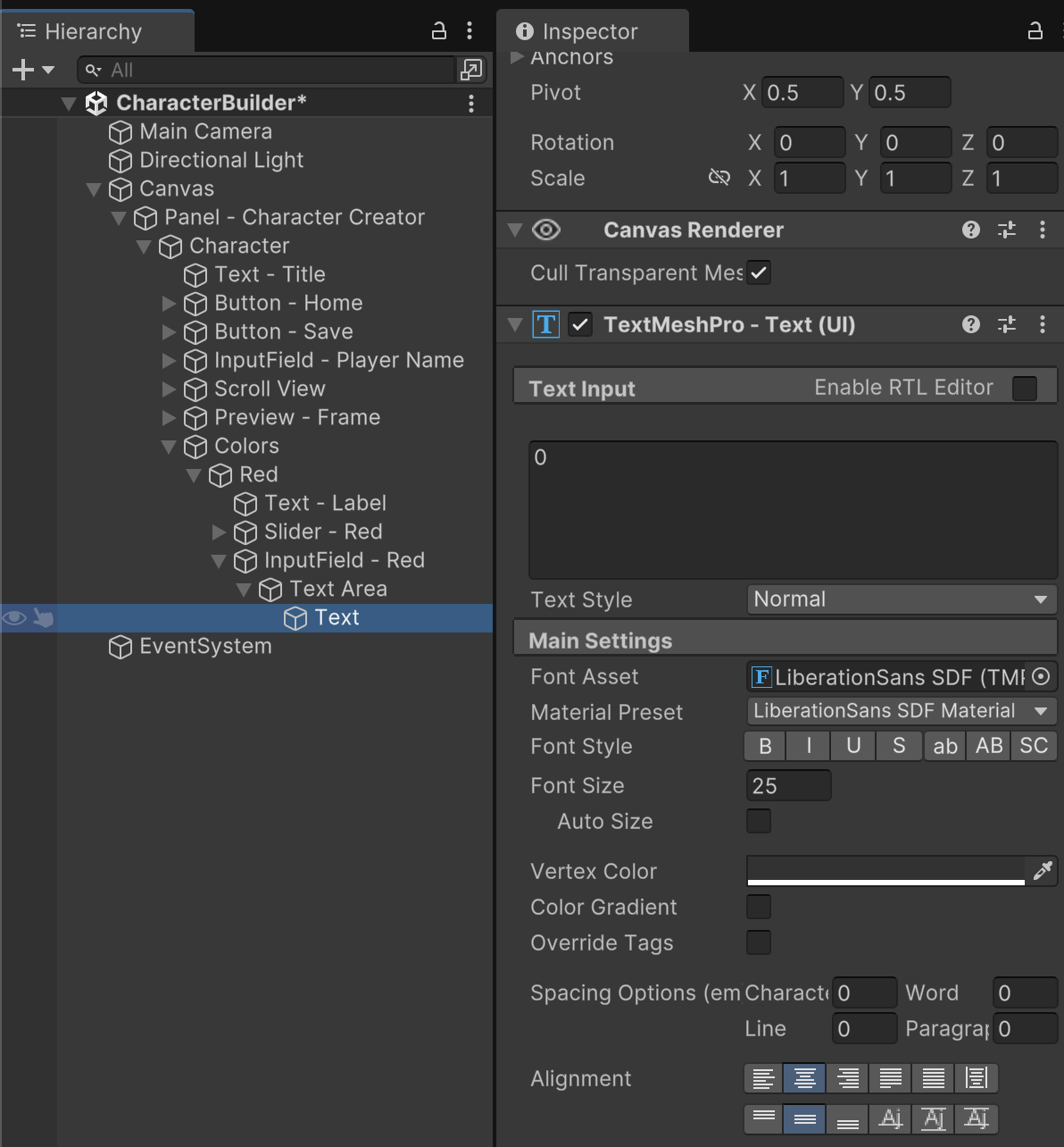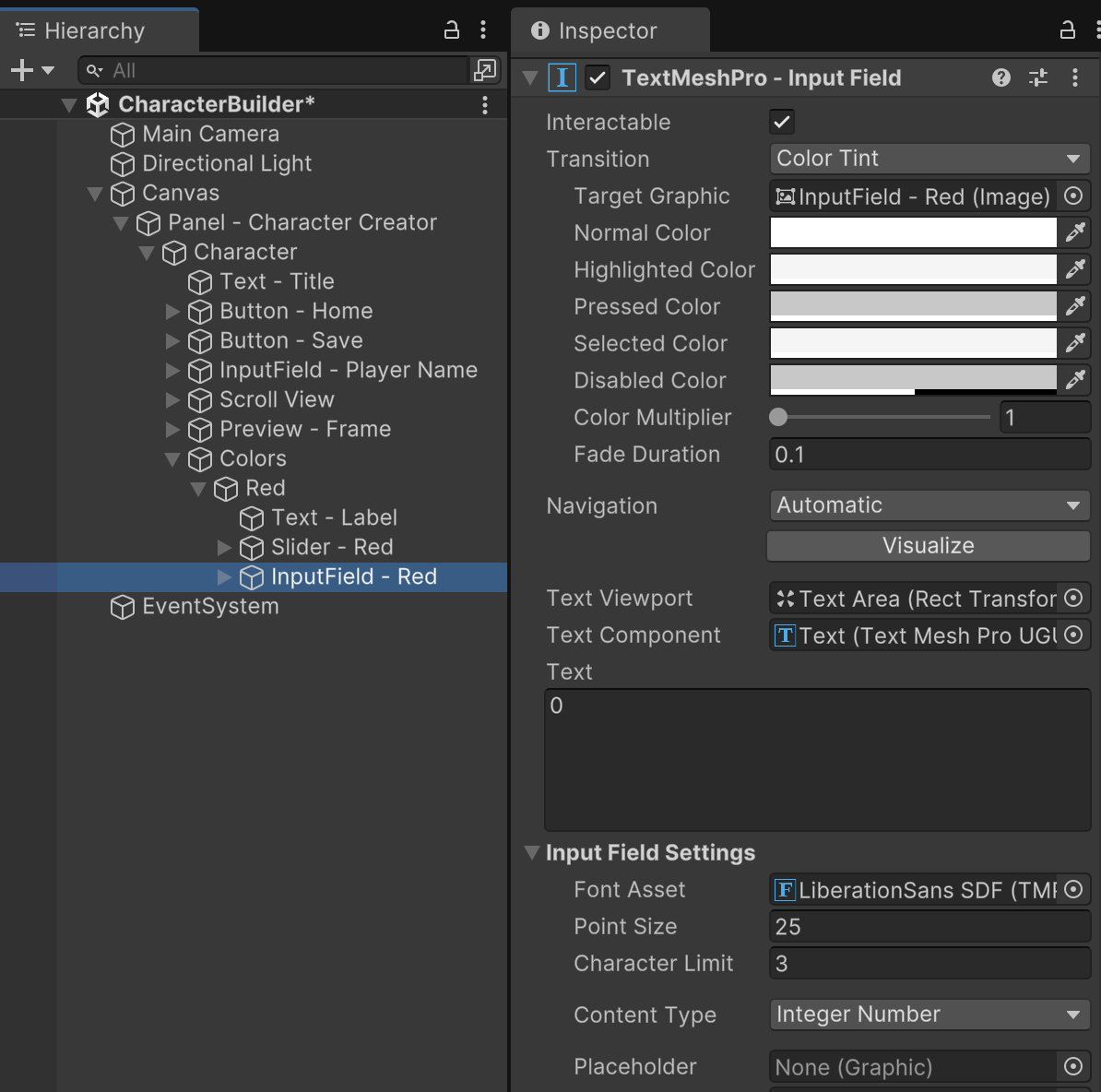 Fully expand the InputField gameObjet and its children. Delete the Placeholder child. On the Text child, customize the Text component so that both its horizontal and vertical alignment are centered. At this point, you should have a completed color customization UI for Red.