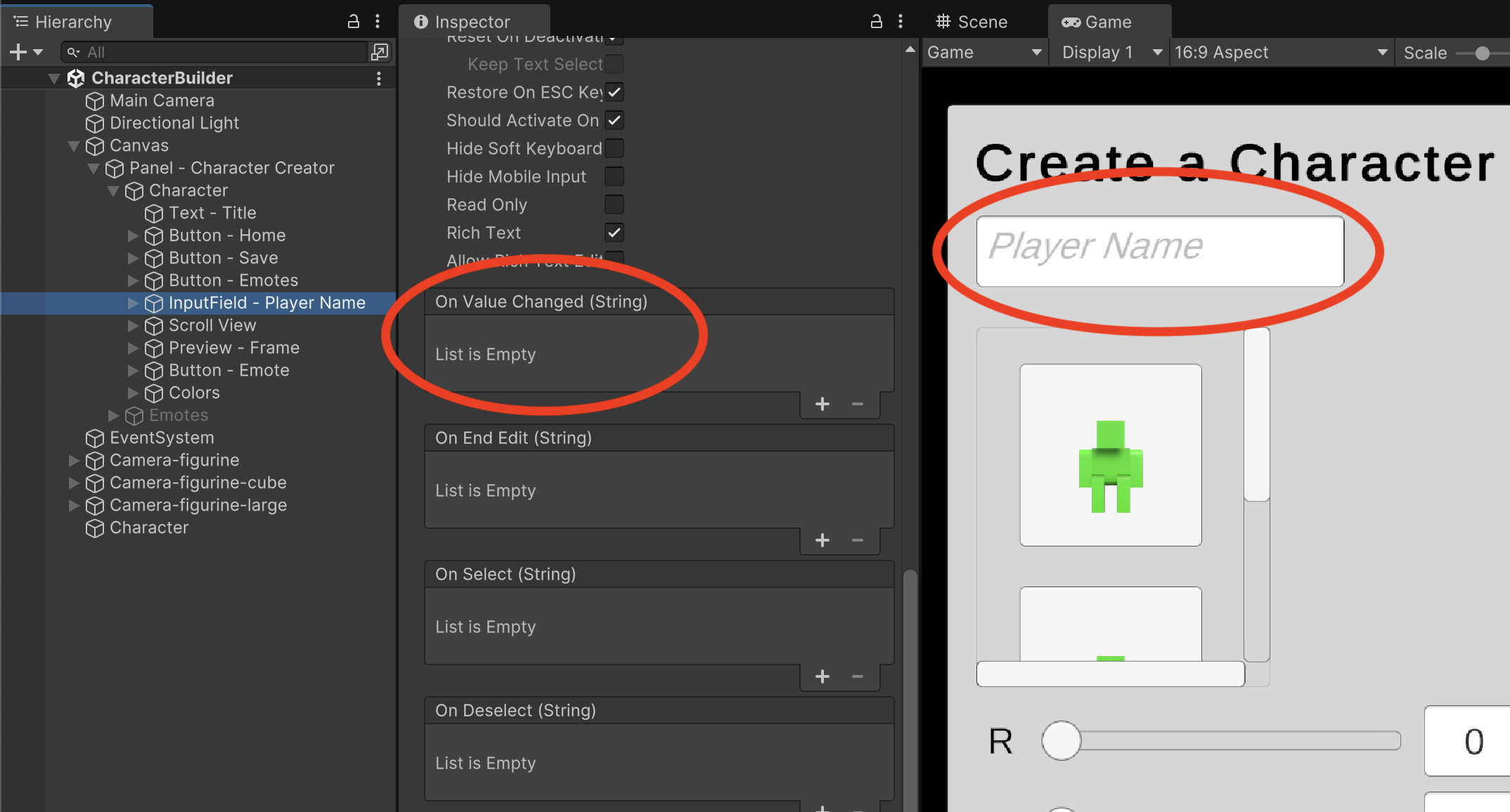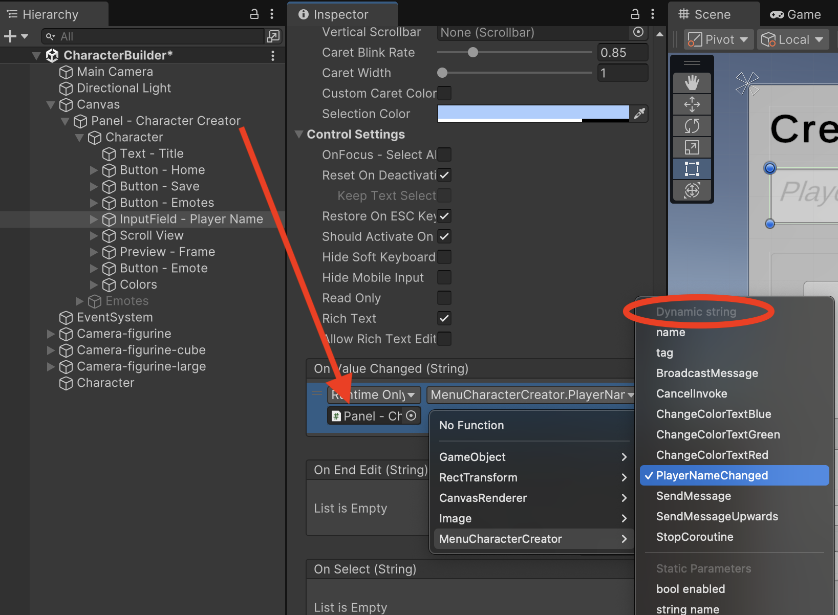 Inspect the input field for the player name, and assign the PlayerNameChanged function as the event for OnValueChanged. PlayerNameChanged appears twice in the functions list, so be sure to use the "dynamic" version. This ensures that the function receives the live text typed by the player rather than a static string.
