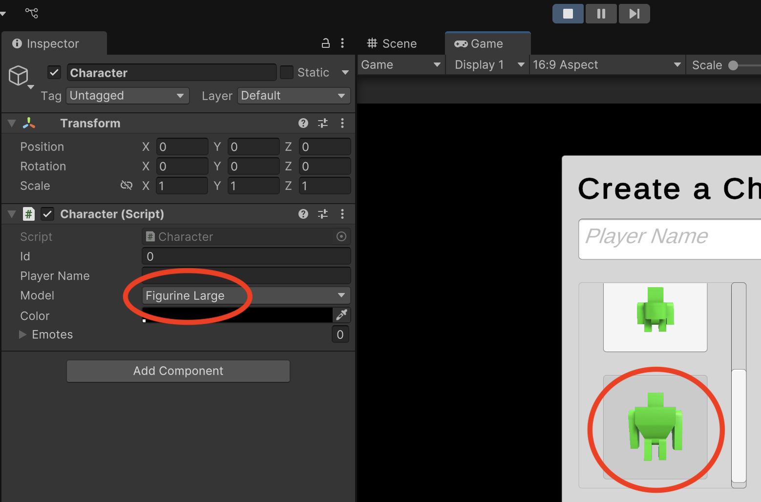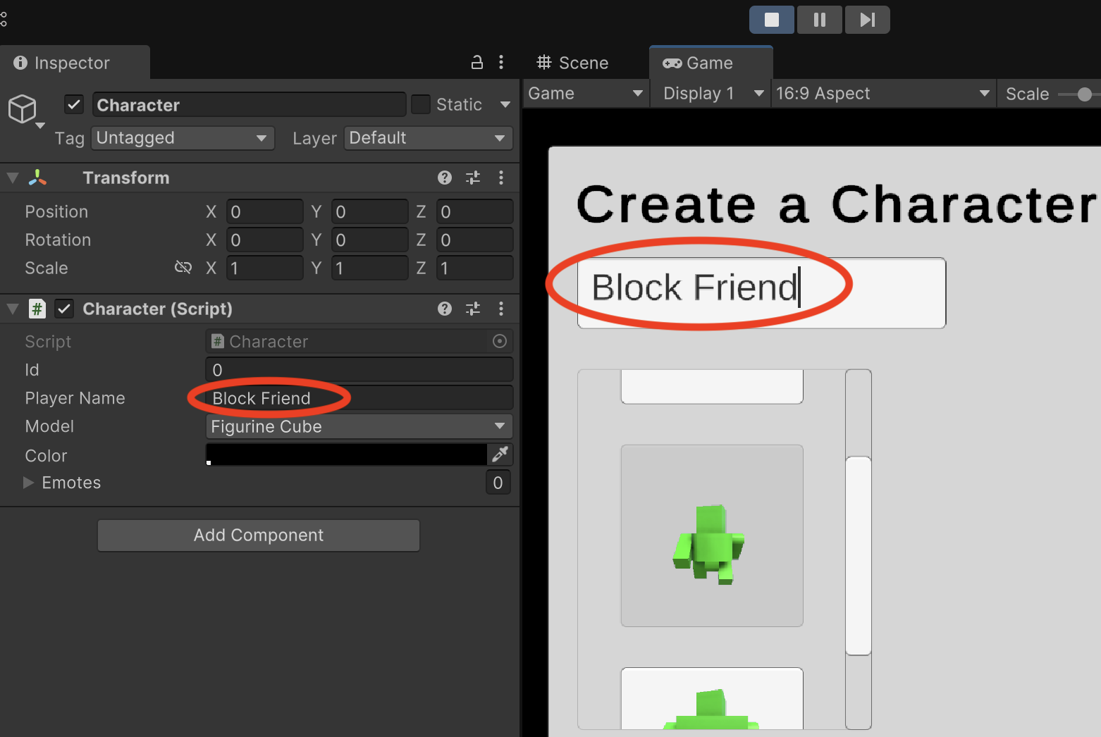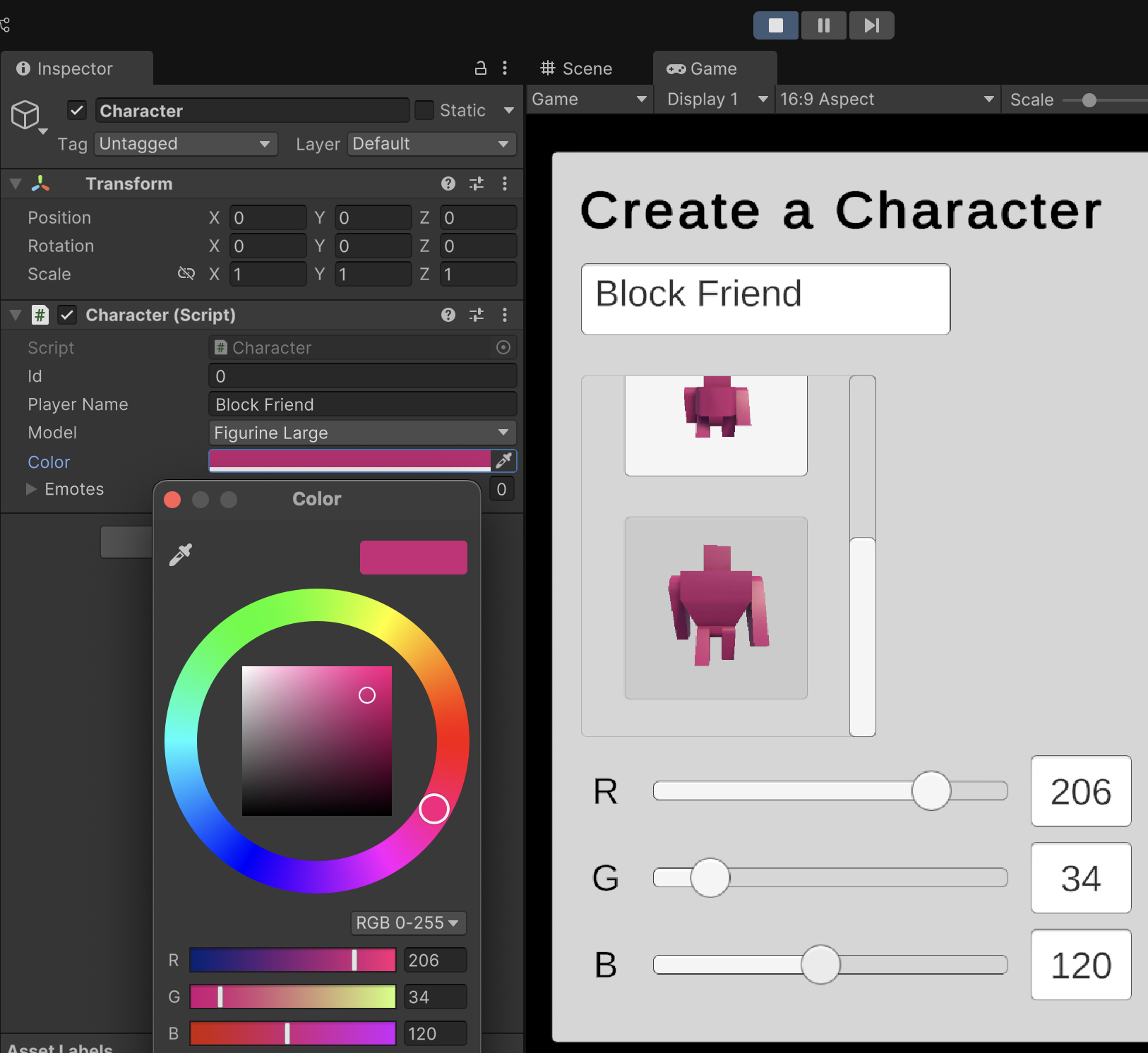 Inspecting the Character component and color property during gameplay should show that the red, green, and blue color values reflected in the character data also match the gameplay UI.
