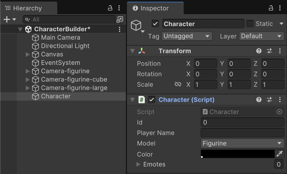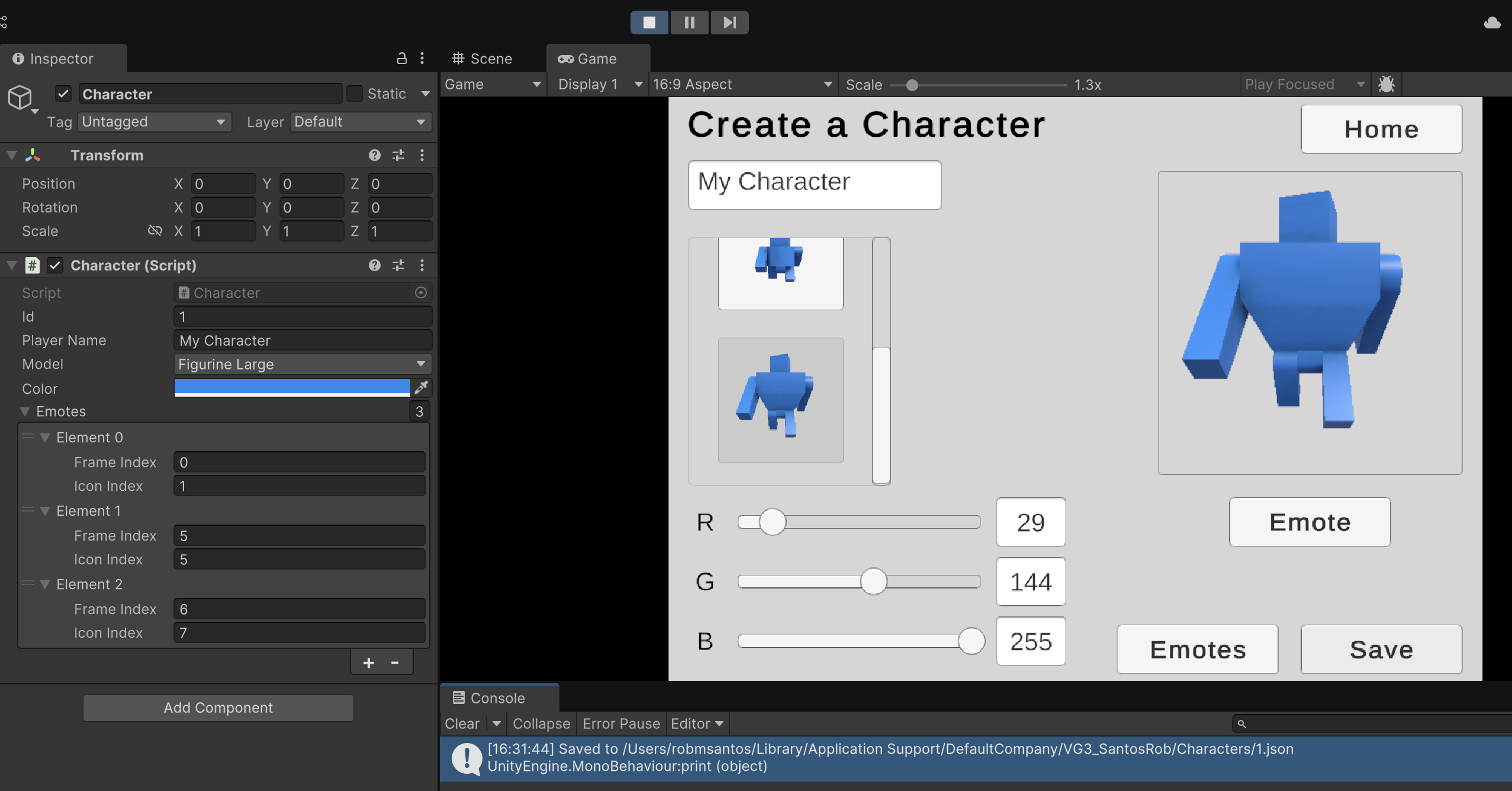 Upon clicking save, you should be able to inspect your Character gameObject and verify that all inspector fields have populated including Id and Emotes. The Console log should also tell you where to find your save file.