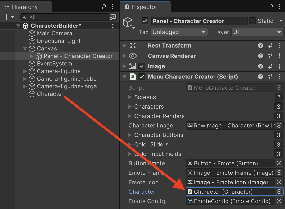 Open MenuCharacterCreator.cs and add an outlet variable to reference our Character component.