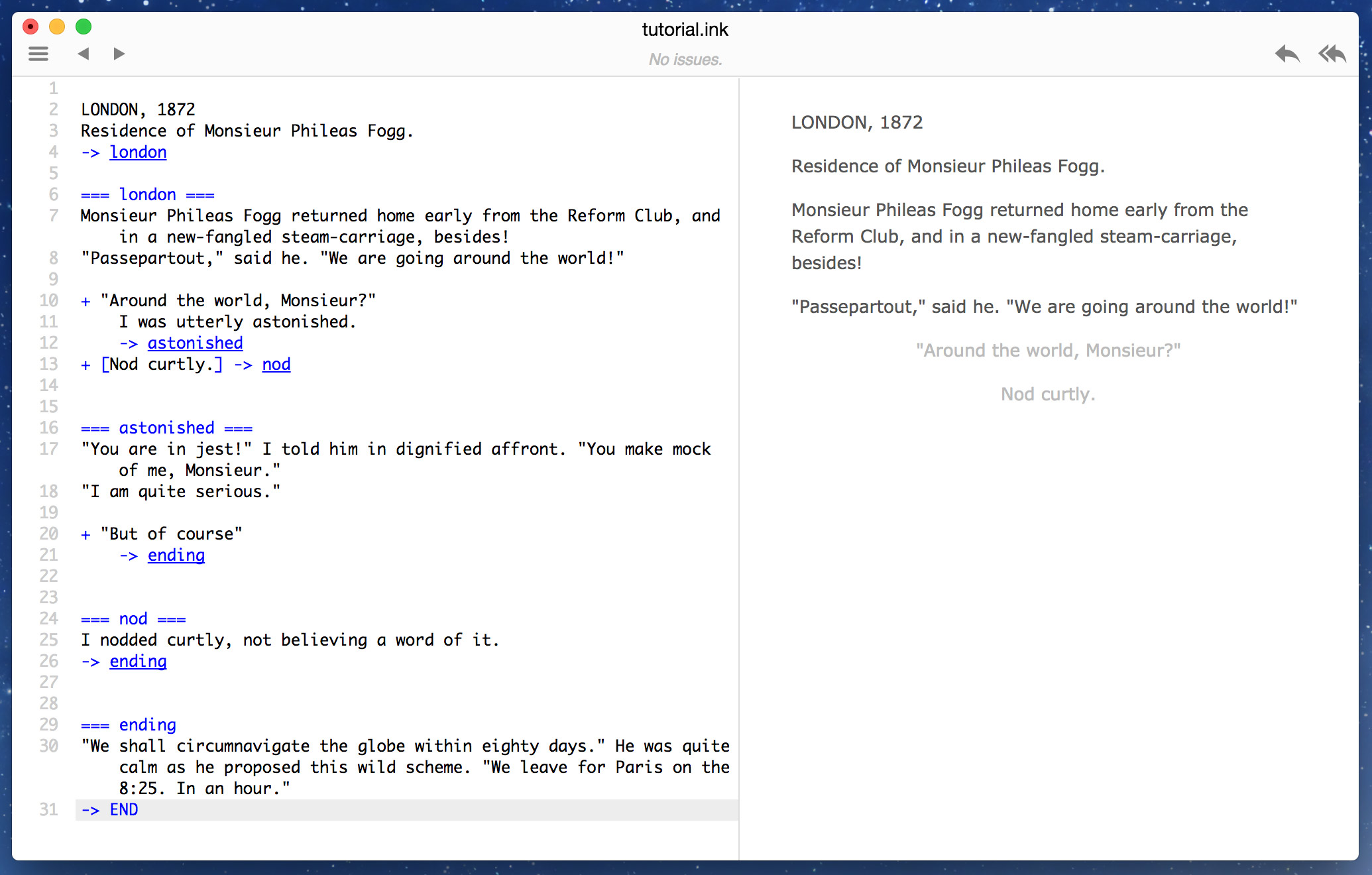 Knots and Diverts provide shortcuts for an Ink story to jump around. "Knots" (denoted by triple = signs at the beginning and end of a line) act as a label for a section of text, and a "divert" (denoted by a ->) jumps a story to a target knot. "END" is a built-in knot in Ink, and most stories eventually divert to the END.