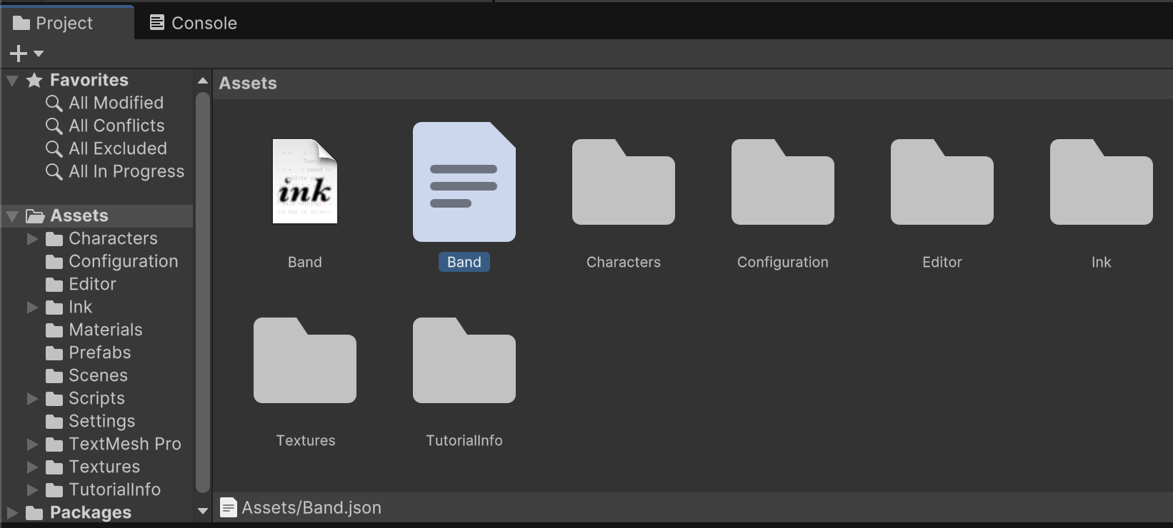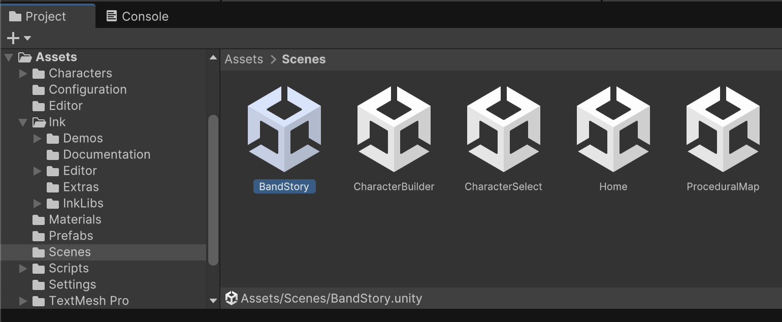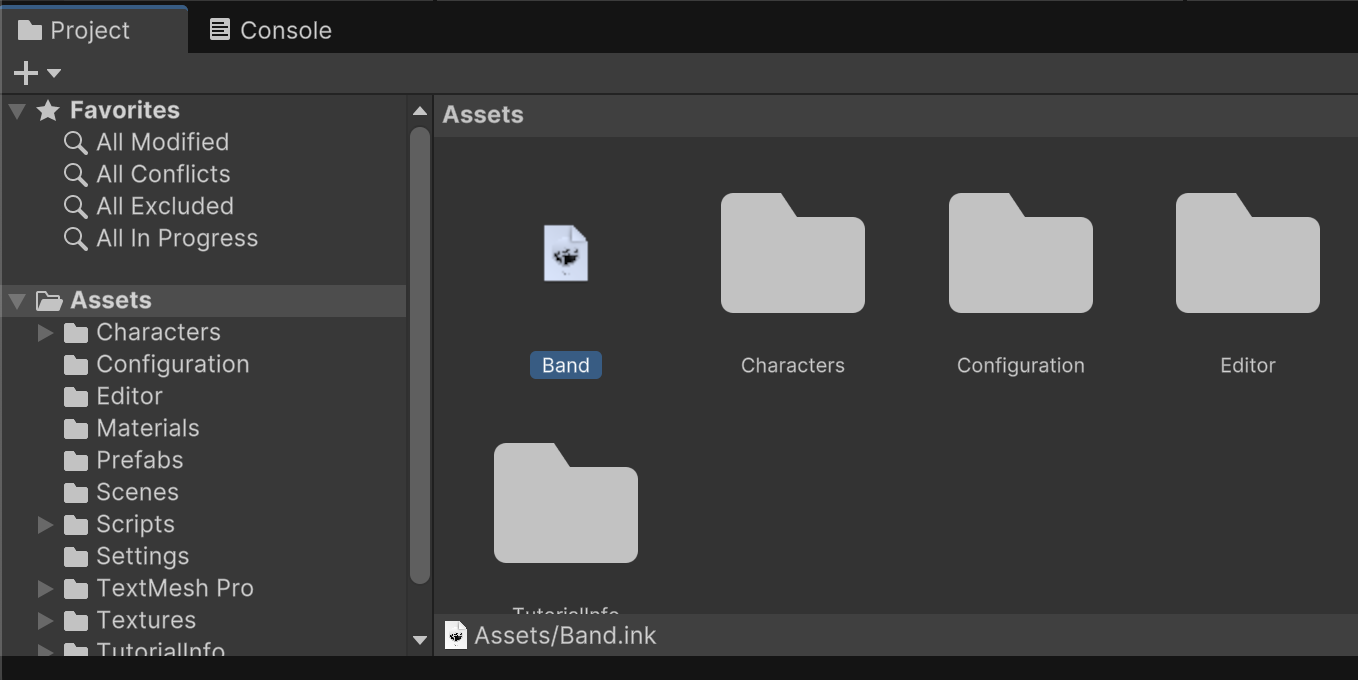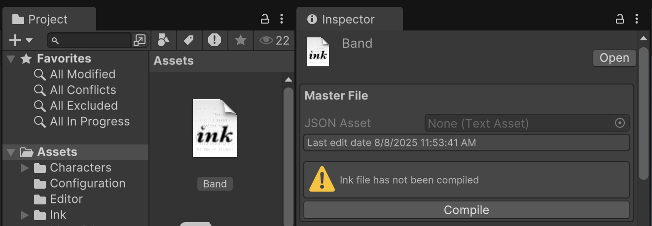 After compiling, there will be a new Band.json file in your /Assets/ folder. This is a version of the Band.ink story that is compatible with the Unity plugin. If you make subsequent edits to the ink file, recompilation for an updated JSON file should be automatic.
