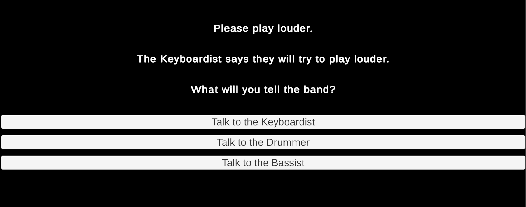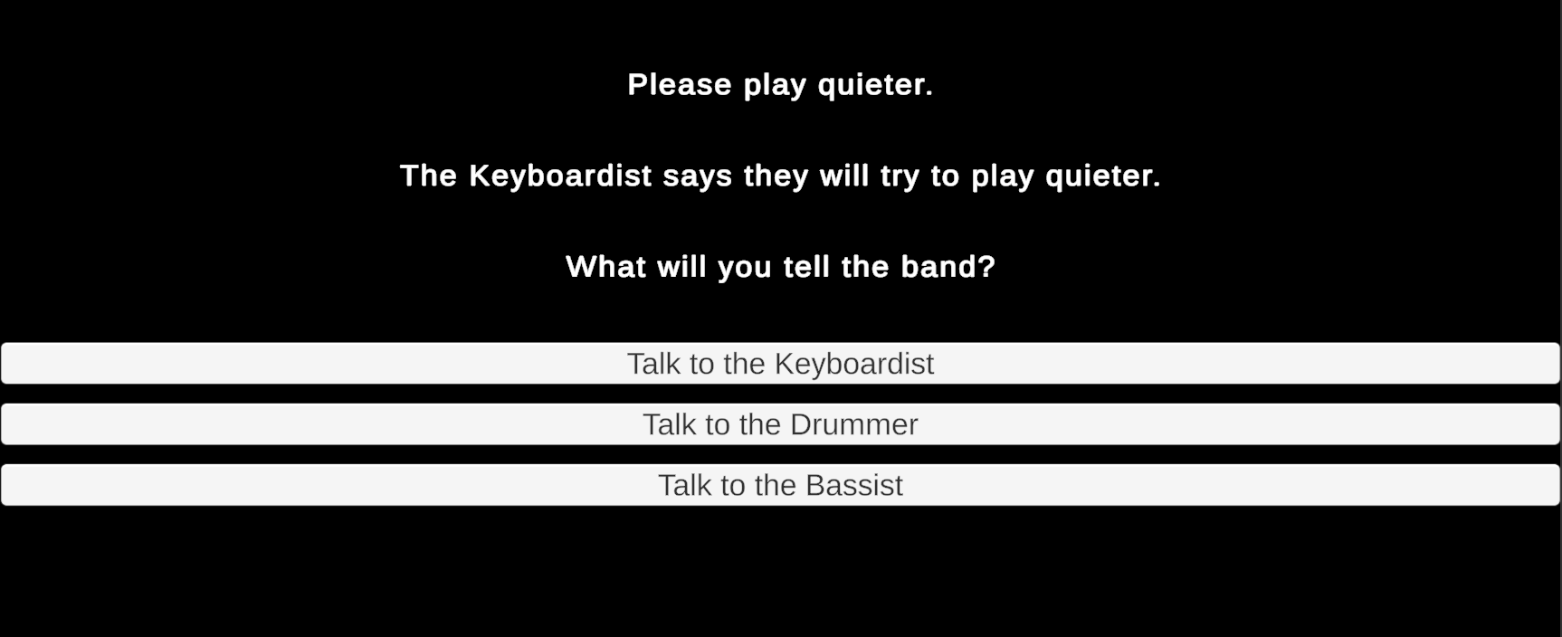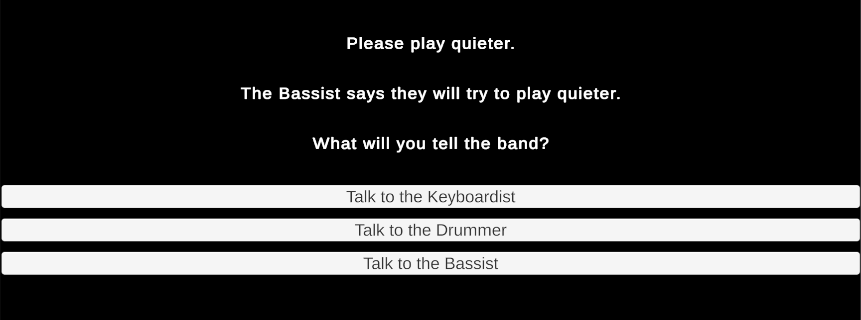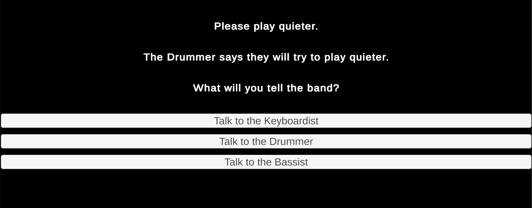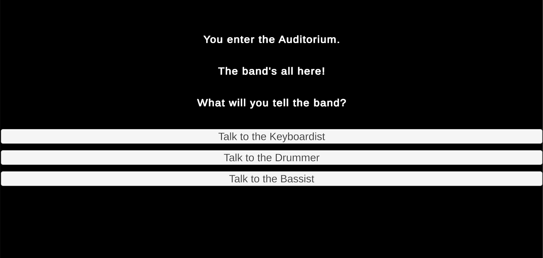 What follows is an interactive story in which the player searches rooms to gather three bandmates who then travel to an auditorium to perform. The sequence in which players visit rooms and gather the bandmates is open-ended. Similarly, the story concludes with an endless conversation in which you can repeatedly ask any of the bandmates to adjust the individual volume of their separate instruments. (An upcoming assignment will use these conversations to influence dynamic music played during the story.)