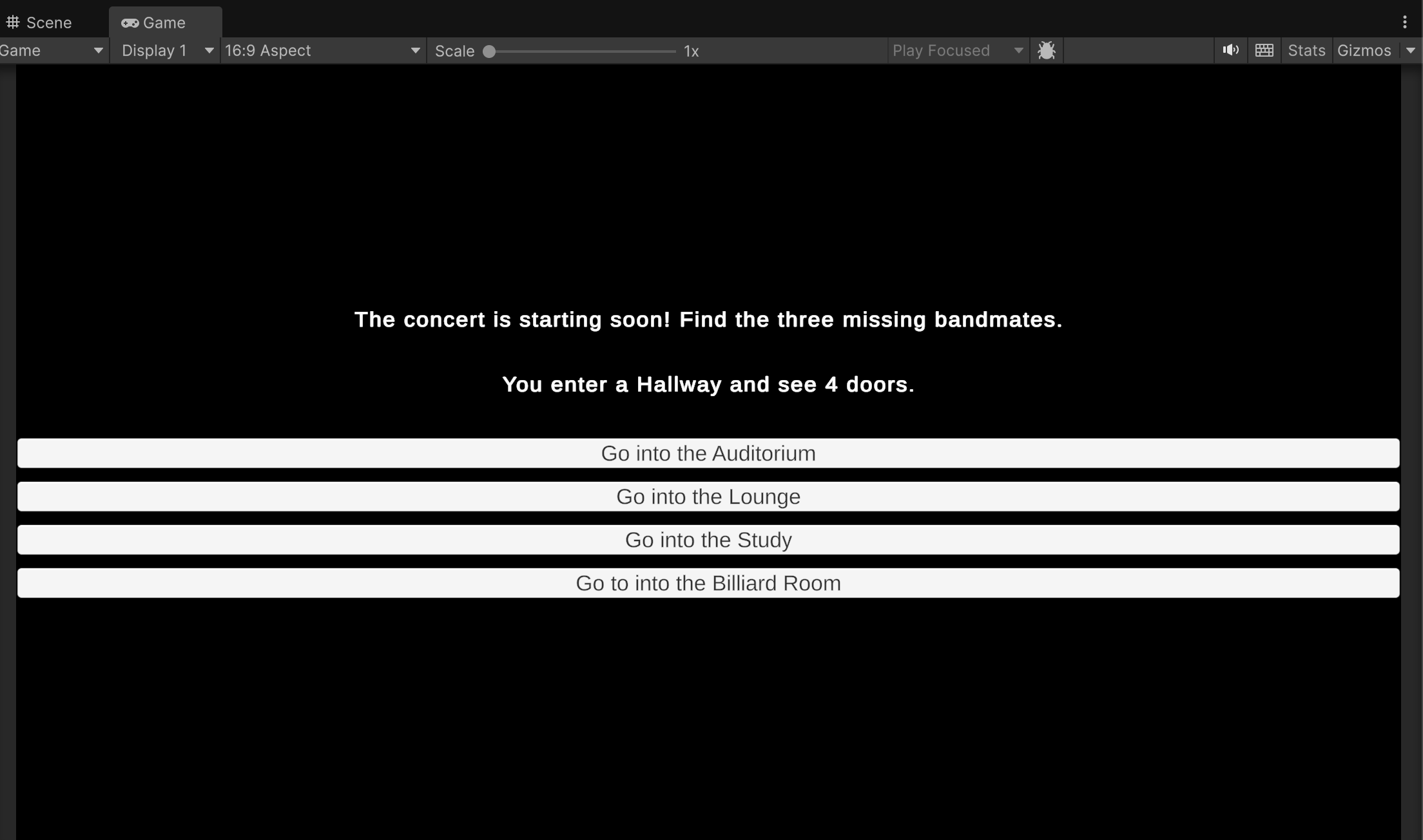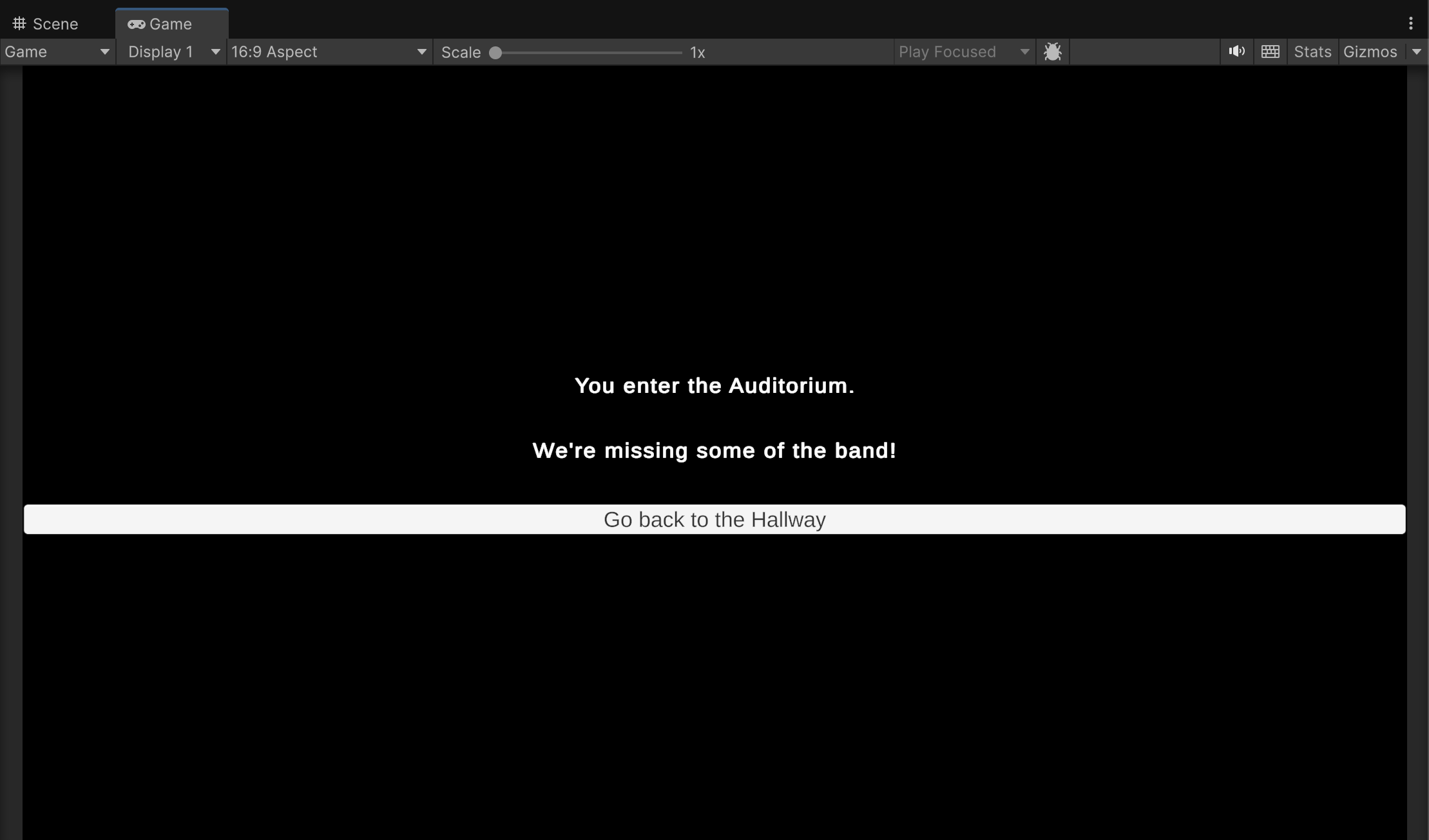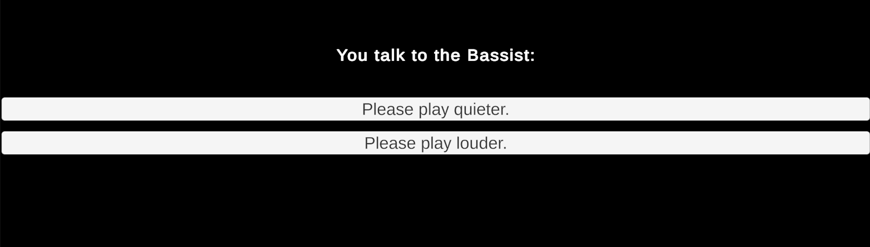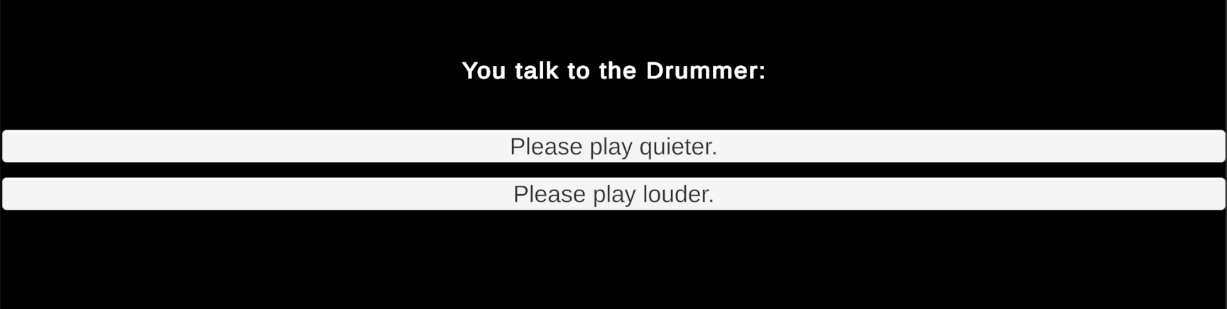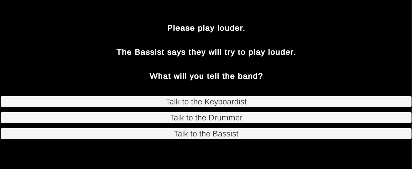What follows is an interactive story in which the player searches rooms to gather three bandmates who then travel to an auditorium to perform. The sequence in which players visit rooms and gather the bandmates is open-ended. Similarly, the story concludes with an endless conversation in which you can repeatedly ask any of the bandmates to adjust the individual volume of their separate instruments. (An upcoming assignment will use these conversations to influence dynamic music played during the story.)
