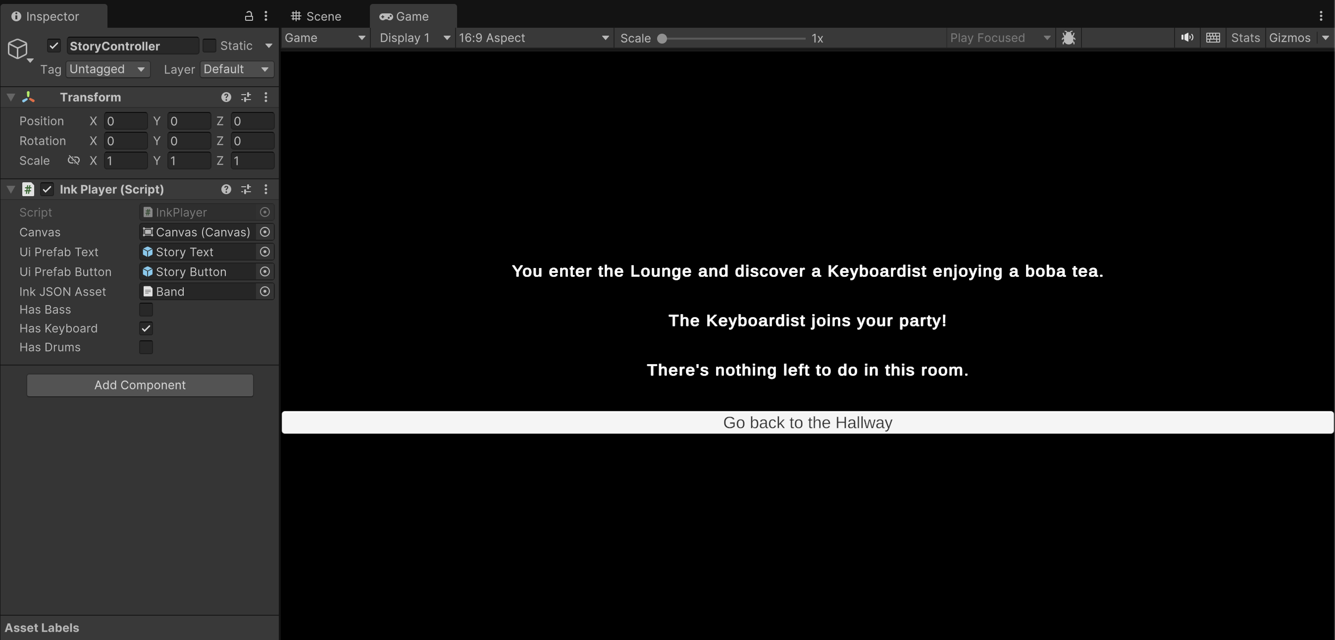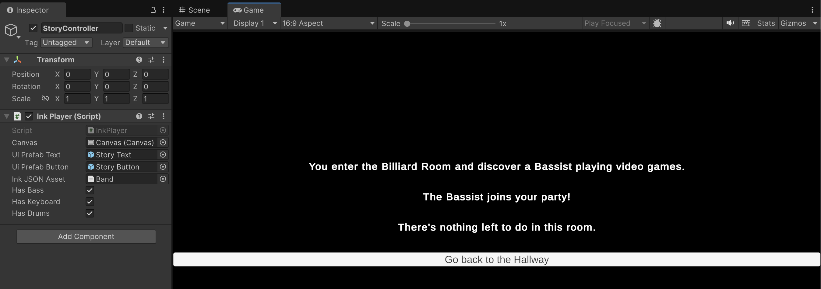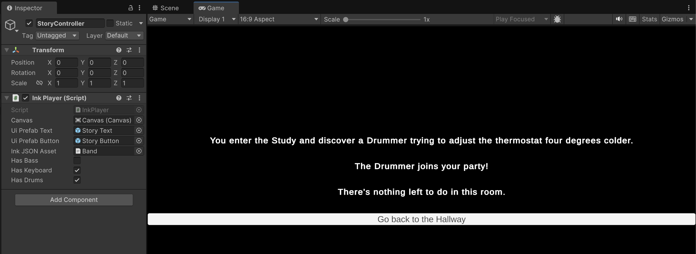 As you explore the rooms, inspect the StoryController game object and confirm that the various hasInstrument booleans update in coordination with the story.
