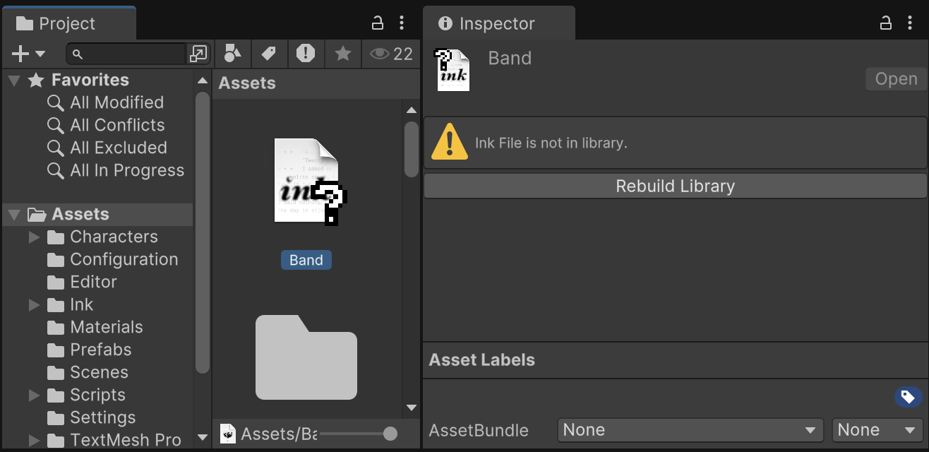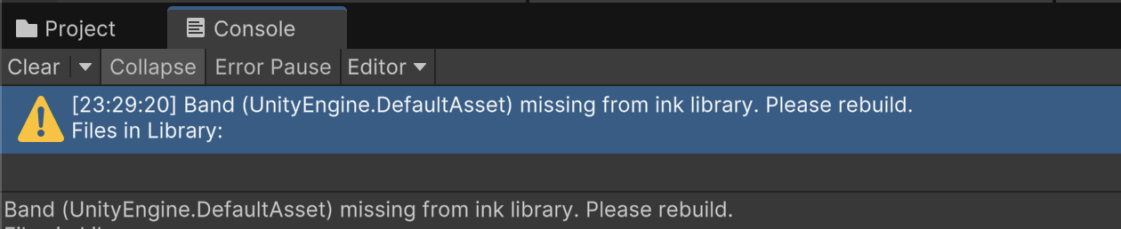 Inspect the Band.ink asset located at /Assets/Band.ink and click the "Rebuild Library" button in the Inspector.